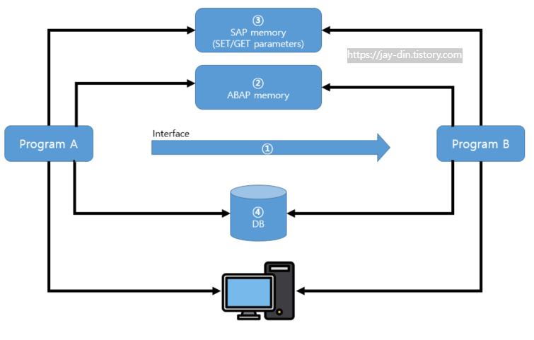 | SAP Memory | SET/GET PARAMETER๋ฅผ ํตํด ์๋ก ๋ค๋ฅธ ABAP Memory ์์ญ์ ๋ฉ๋ชจ๋ฆฌ ๊ณต์ ๊ฐ๋ฅ |