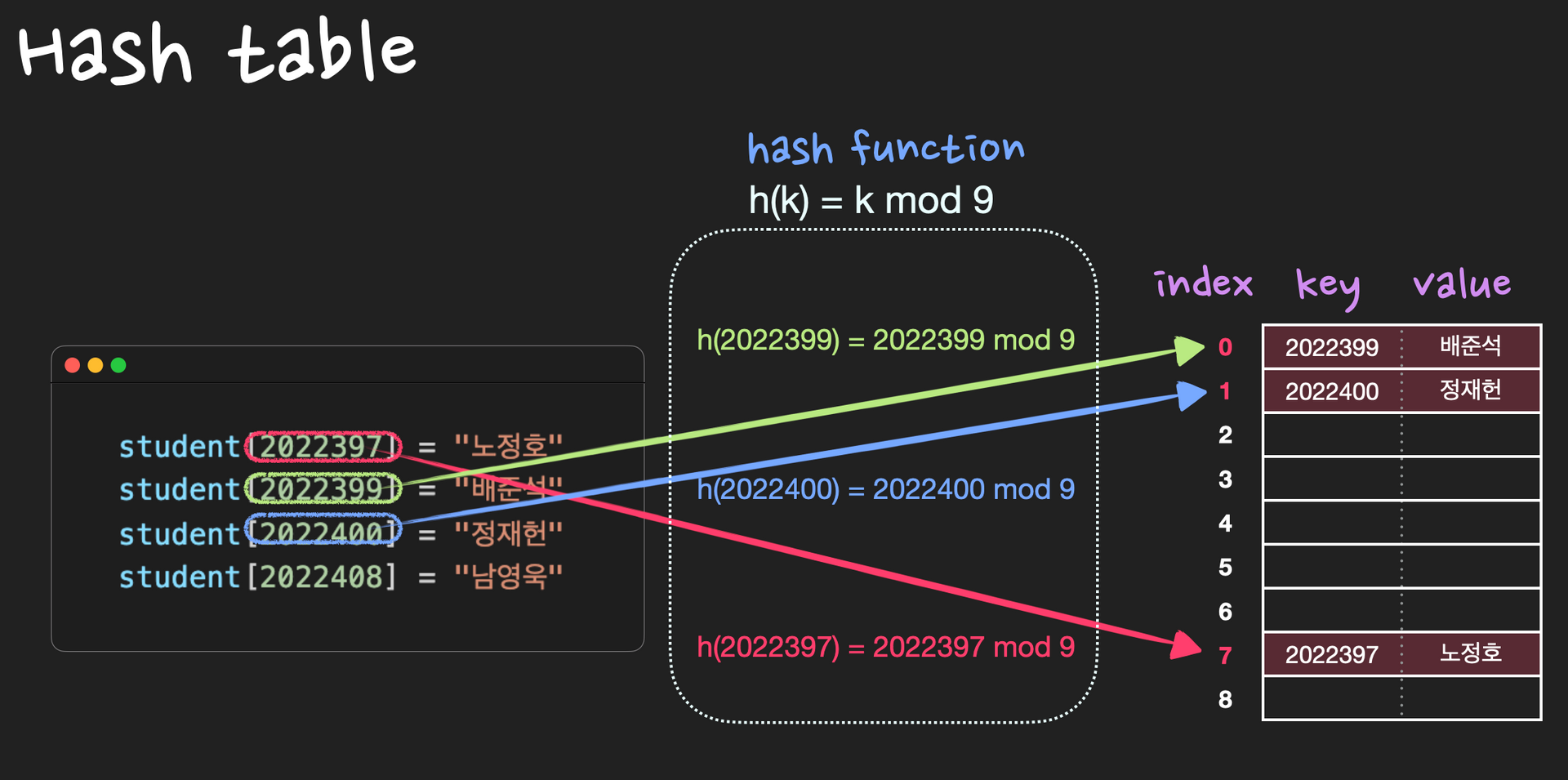 hash table์ hash function h๋ฅผ ์ด์ฉํด์ (key, value)๋ฅผ index: h(k)์ ์ ์ฅํ๋ค.