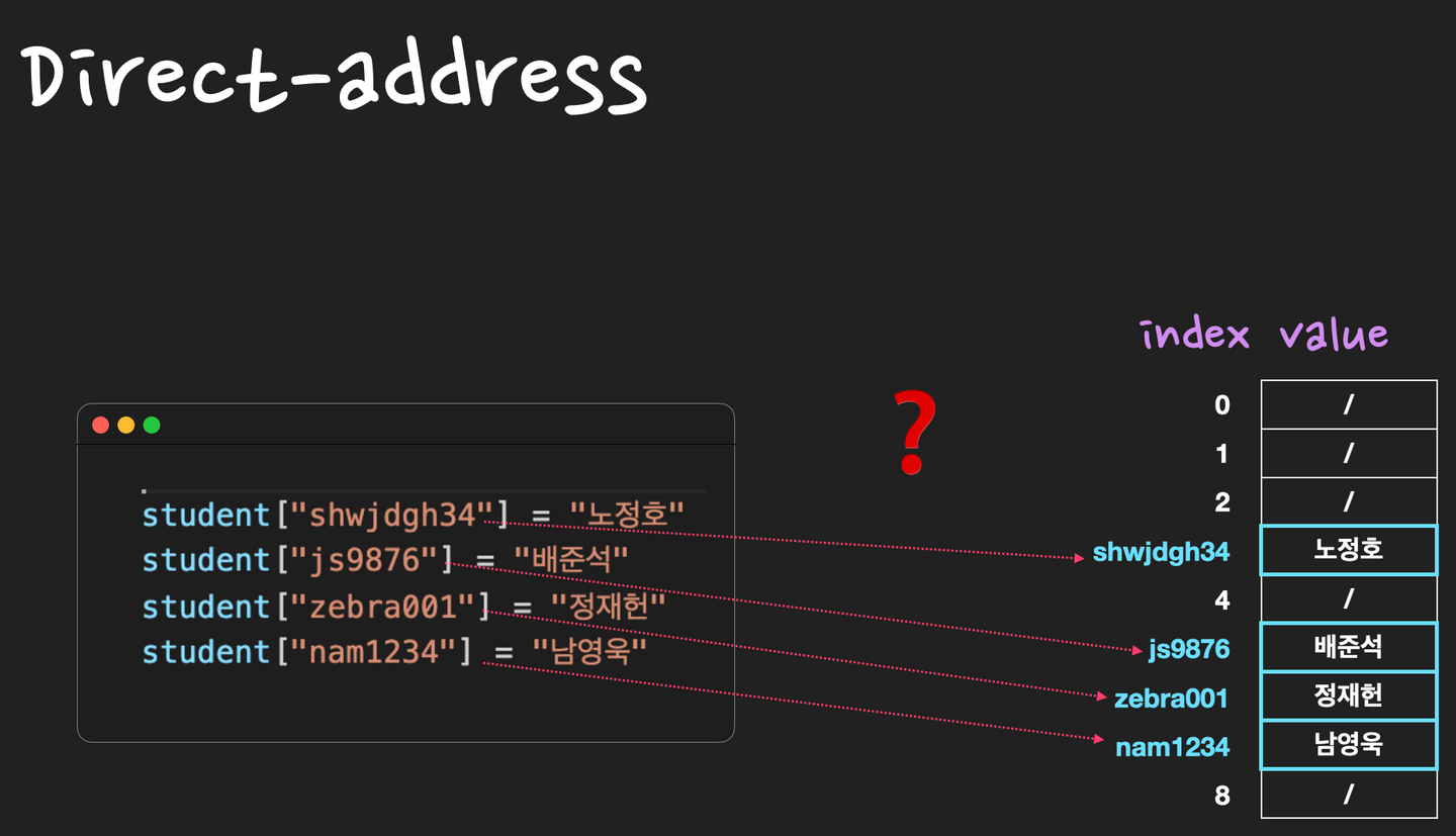 Direct-address Table์ด๋, key ๊ฐ์ผ๋ก k๋ฅผ ๊ฐ๋ ์์๋ index k์ ์ ์ฅํ๋ ๋ฐฉ์์ด๋ค.