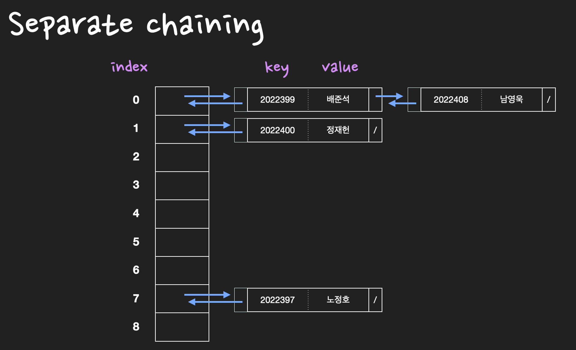 | separete chaining | linked list๋ฅผ ์ด์ฉํ๋ค. collision์ด ๋ฐ์ํ๋ฉด linked list์ ๋ ธ๋(slot)๋ฅผ ์ถ๊ฐํ์ฌ ๋ฐ์ดํฐ๋ฅผ ์ ์ฅํ๋ค. |