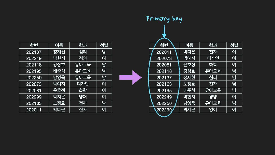 ํน์ column์ ๊ธฐ๋ณธํค(primary key)๋ก ์ง์ ํ๋ฉด ์๋์ผ๋ก ํด๋ฌ์คํฐํ ์ธ๋ฑ์ค๊ฐ ์์ฑ๋๊ณ , ํด๋น column ๊ธฐ์ค์ผ๋ก ์ ๋ ฌ์ด ๋ฉ๋๋ค. Table ์์ฒด๊ฐ ์ ๋ ฌ๋ ํ๋์ index์ธ ๊ฒ์ ๋๋ค. ๋ง์น ์์ด์ฌ์ ์ฒ๋ผ ์ฑ ์ ๋ด์ฉ ์์ฒด๊ฐ ์ ๋ ฌ๋ ๊ฒ์ ๋ ์ฌ๋ฆฌ๋ฉด ์ฝ์ต๋๋ค. |