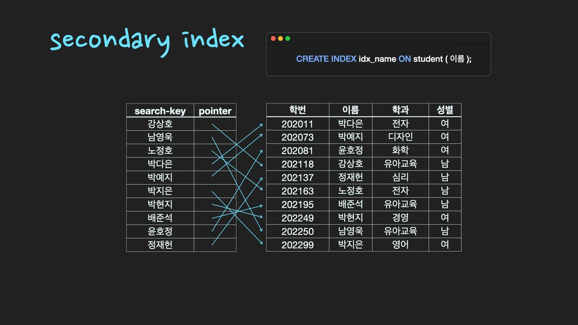| ๋ณด์กฐ ์ธ๋ฑ์ค (secondary index) |