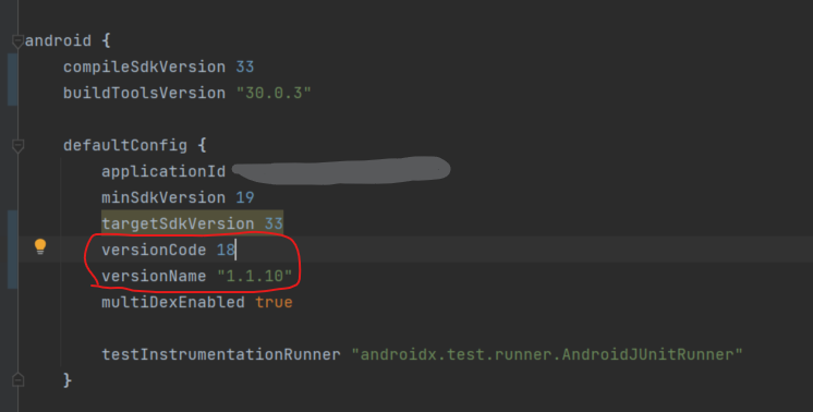 `versionName` ๊ณผ `versionCode`๋ฅผ ๋ณ๊ฒฝํด์ค๋๋ค.