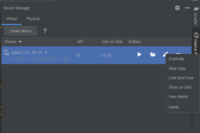 1. ์ ๋ฎฌ๋ ์ดํฐ๋ฅผ ์ฌ์ฉํ๊ณ ์์๊ธฐ ๋๋ฌธ์ Device Manager์์ ํด๋น ์ ๋ฎฌ๋ ์ดํฐ๋ฅผ ์ ํํฉ๋๋ค.