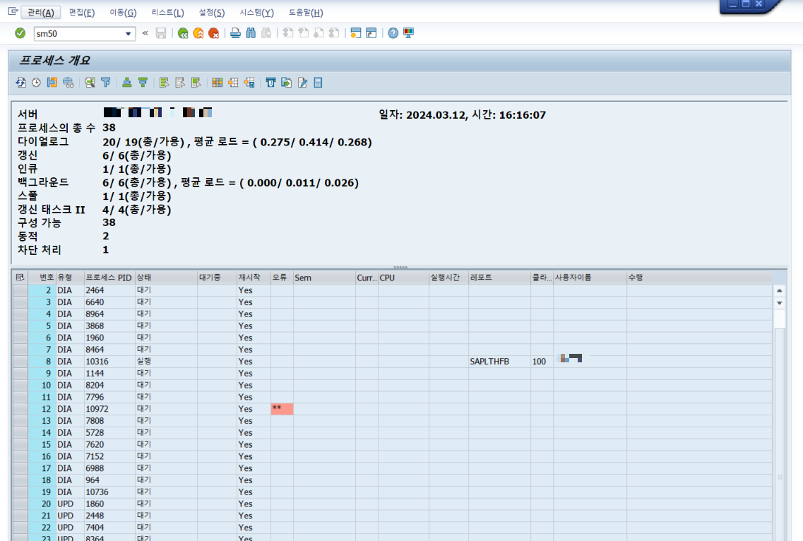 ν°μ½λ SM50μ SAP μμ€ν μμ νμ¬ μ€ν μ€μΈ μμ νλ‘μΈμ€λ₯Ό λͺ¨λν°λ§νλλ° μ¬μ©λ©λλ€.