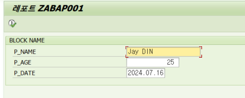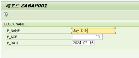 - SELECTION-SCREEN์์ ์ ๋ ฅ๋ฐ์ ๊ฐ์ ํ๋ก๊ทธ๋จ ๋ณ์ (lv_name, lv_age, lv_date)์ ํ ๋นํฉ๋๋ค.