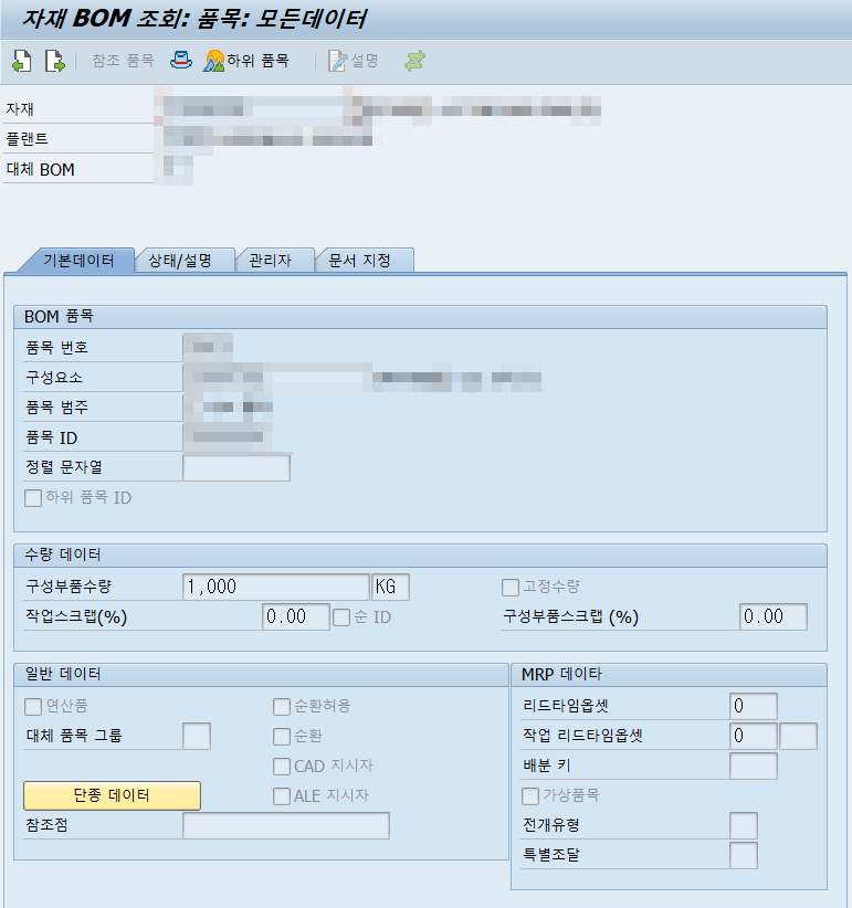 - ν€λ(Header): BOMμ μμ μ λ³΄κ° ν¬ν¨λ©λλ€. μ¬κΈ°μλ μμ ν μ 보(μμ¬ λ²νΈ), BOM μν, μ ν¨ λ μ λ±μ΄ ν¬ν¨λ©λλ€.
