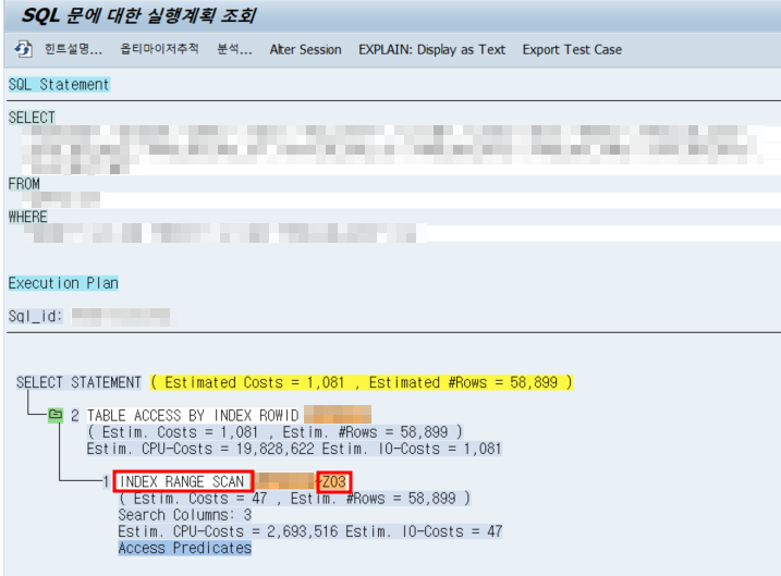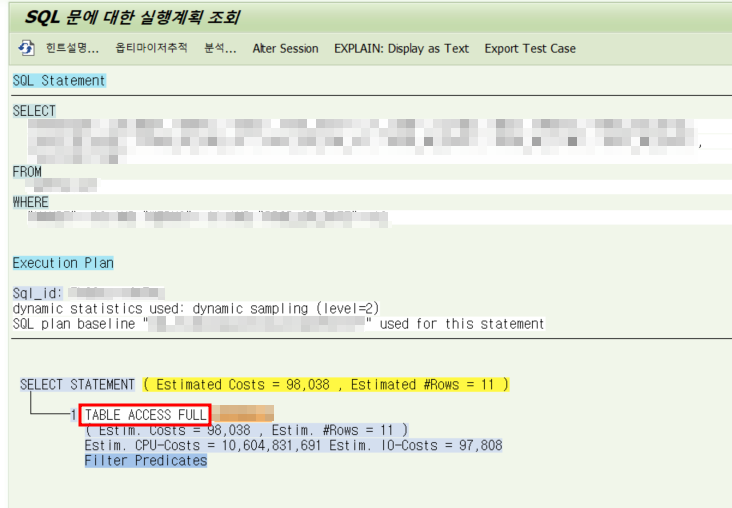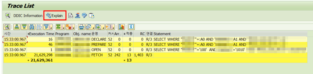 - ๋ฌธ์ ๋ฐ์ํ ํธ๋์ญ์ ์ ํ ์ด๋ธ ๊ด๋ จ SQL ๋ฌธ์ฅ์ ์ฐพ์์, ํ ์ ํํ๊ณ `Explan` ํด๋ฆญ