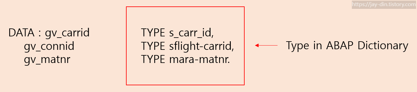 - ABAP Dictionary Data Type์ ABAP ํ๋ก๊ทธ๋จ ๋ด์์ TYPE ๊ตฌ๋ฌธ์ ์ด์ฉํ ์ ์๋ค.