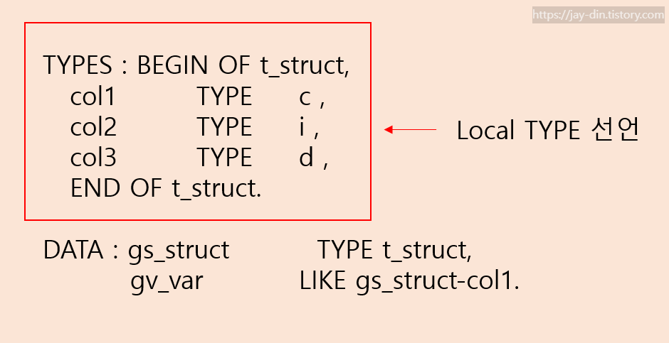 - ABAP ํ๋ก๊ทธ๋จ ๋ด์์ Predefined ABAP Type์ ์ด์ฉํ์ฌ Local Type์ ์์ฑํ๋ค.
