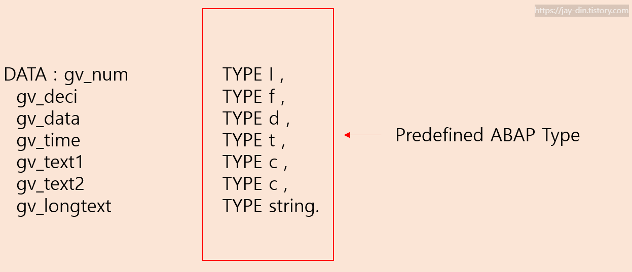 ABAP์์ ์ ๊ณต๋๋ ๊ธฐ๋ณธ ํ์ ์ ์ด์ฉํ์ฌ ๋ฐ์ดํฐ๋ฅผ ์ ์ธํ๋ ๋ฐฉ์์ ๋๋ค.